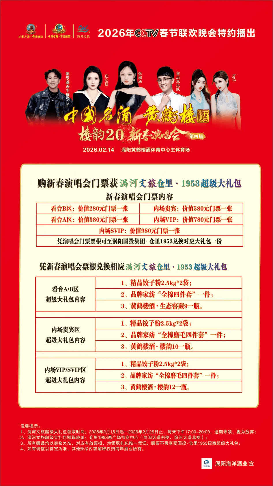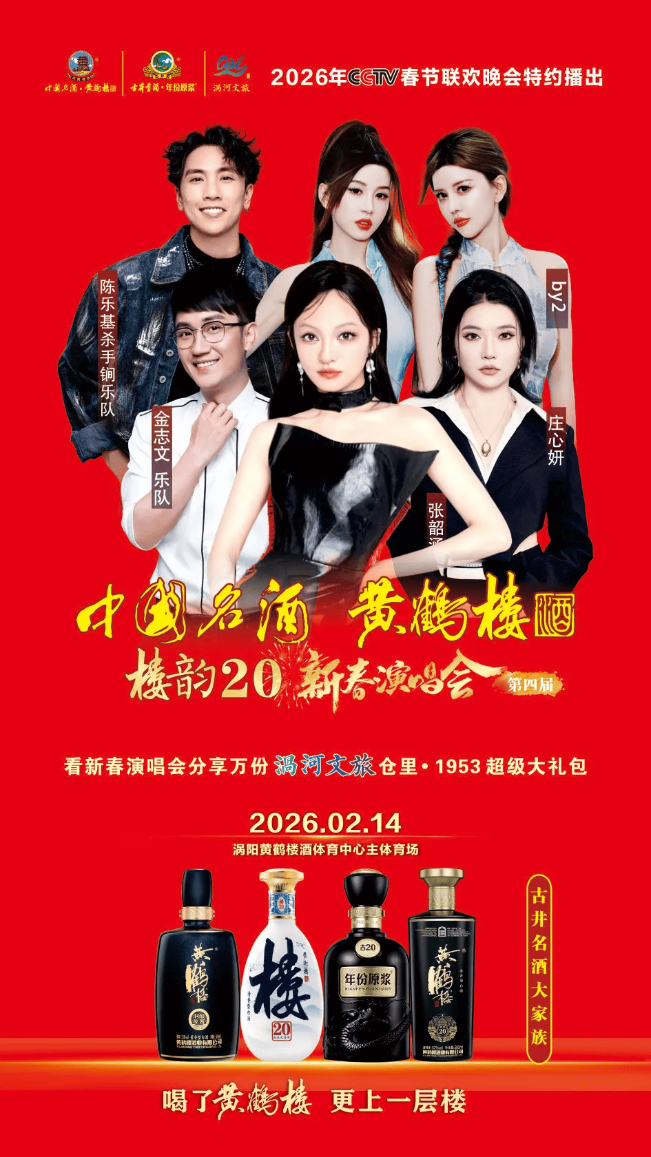 活动内容:一场视听盛宴将在涡阳黄鹤楼体育中心热力开演——黄鹤楼酒“楼韵20新春演唱”重磅来袭。张韶涵、庄心妍、陈乐基、金志文、BY2等多位实力唱将齐聚涡阳,用歌声点燃春节前夕的欢乐氛围。