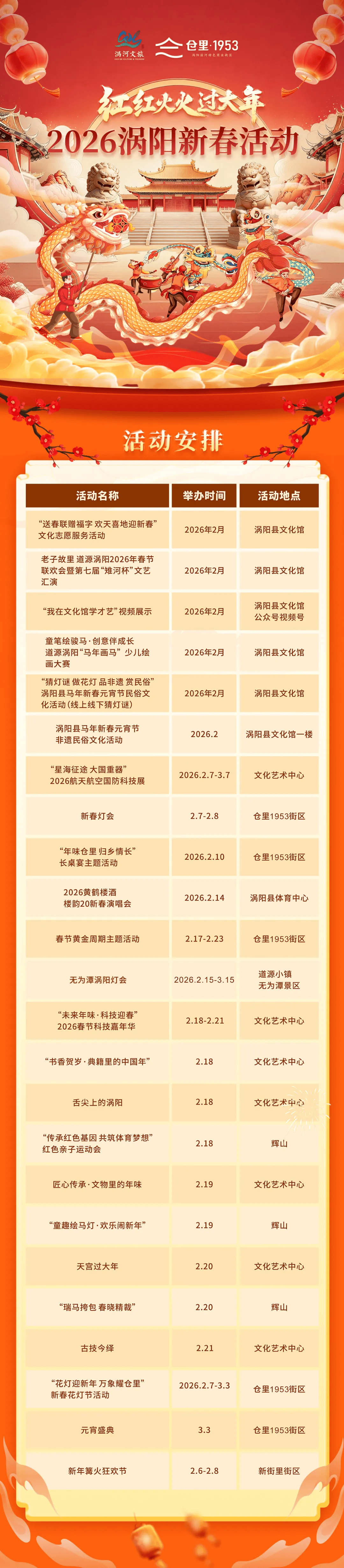 活动内容:传统非遗十八番锣鼓、小车子、旱船、黑驴、舞龙和花鼓灯、九曲黄河阵灯谜等民俗表演。