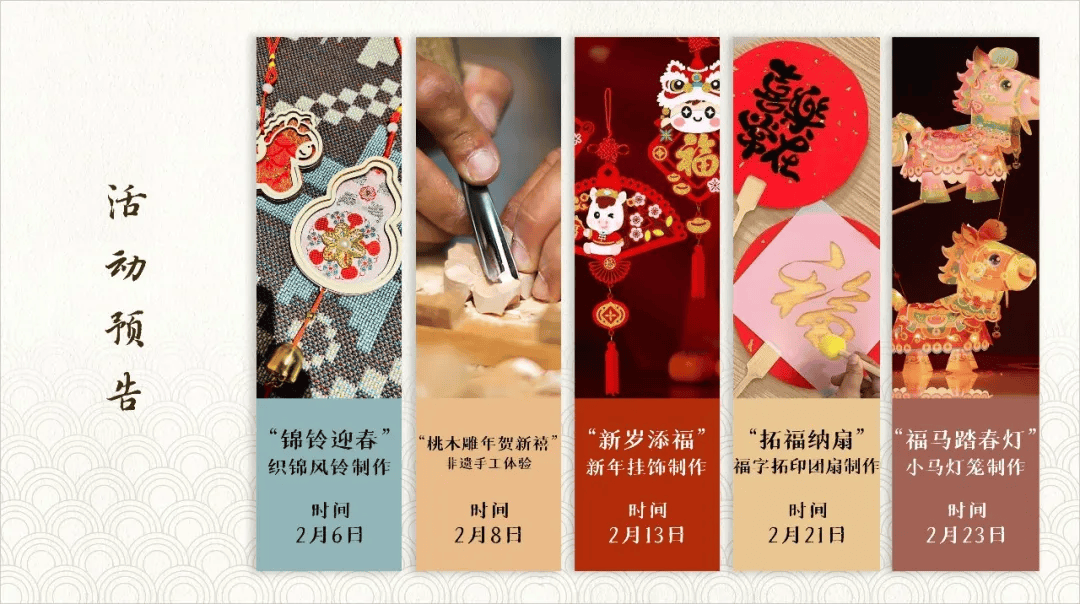 活动内容:举办“马舞新春图片展”(腊月廿九-正月十六)和星光祈福、非遗年味手工坊、记忆宫殿挑战、“我在博物馆画马年文物”、文创集市夜、书写楹联等活动(正月初一至正月初七)。