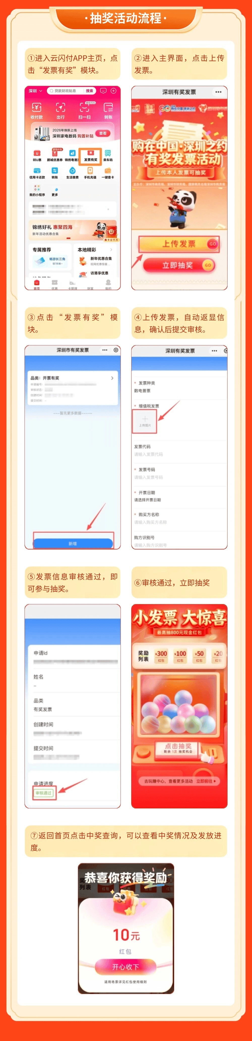 个人消费者取得符合条件的发票后,通过“云闪付”App进入有奖发票有关界面,上传清晰电子发票图片并确认OCR识别的票面内容(包含发票号码、价税合计金额、开票时间、购买方名称等),系统核验成功便可参与有奖发票抽奖活动。每位消费者每日最多可上传5张(含),每月最多可上传45张(含)。